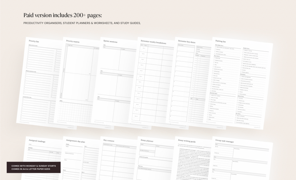 An assortment of thoughtfully designed templates to achieve your goals — be that improving grades, feeling less overwhelmed, or building healthy study habits.