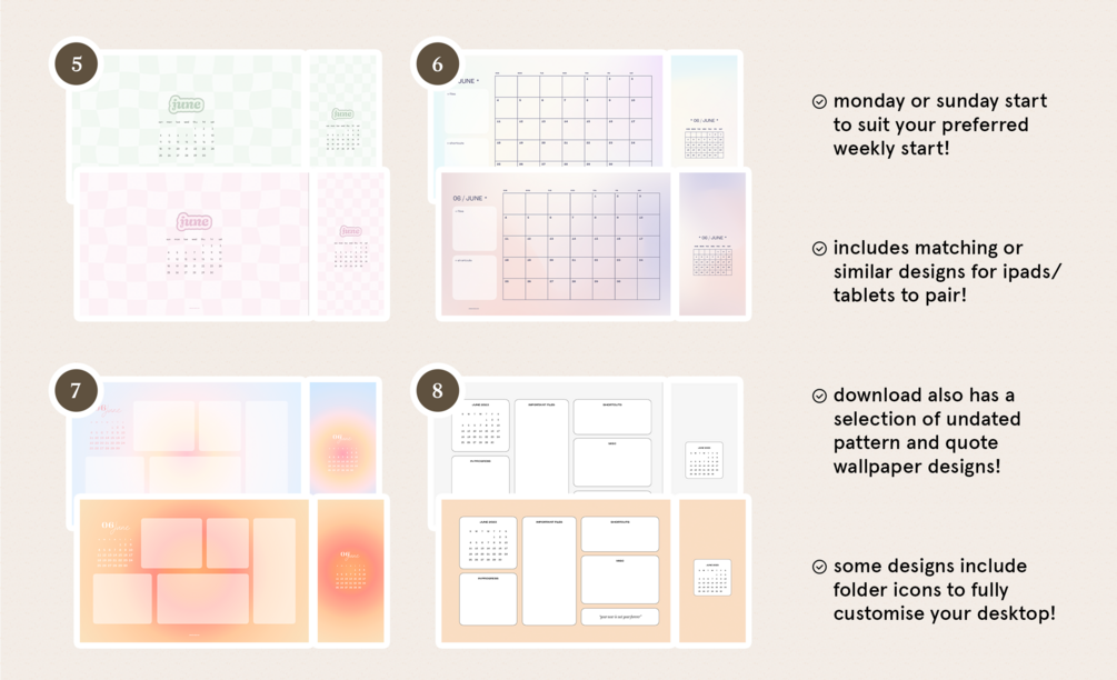 Keep your devices organised and a monthly calendar easily accessible as a background! Including 40+ separate designs for computers, tablets and phones - there should be a style perfect for you. Includes Monday & Sunday starts to suit your preferences.
