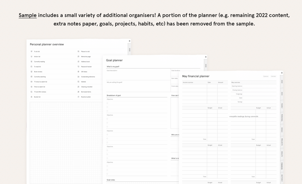 - etc: contents page (some links do not work in sample), May finances, goal plans, projects, to dos, to be read/watched; notes section.
