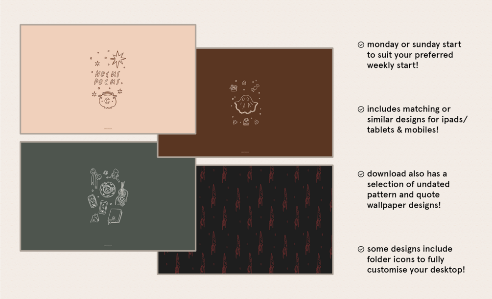 Keep your devices organised and a monthly calendar easily accessible as a background! Including 24 designs for computers, tablets and phones - there should be a style perfect for you. Includes Monday & Sunday starts to suit your preferences.