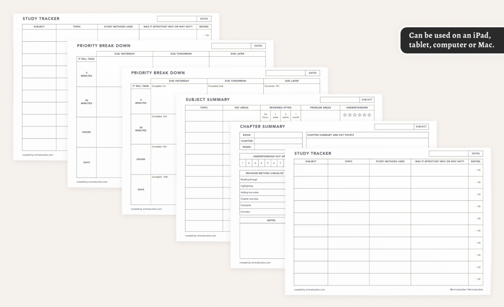 Got exams, study or revision to do? This printables are great for organising and prioritising the important things. Everything is undated for continuous use. These files work as printables or on your digital device.