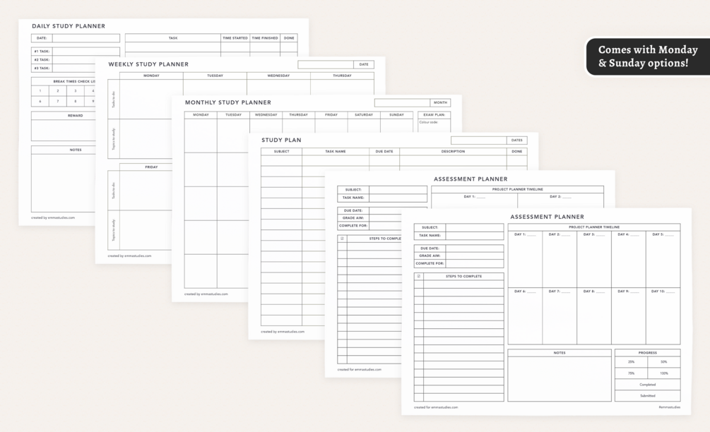 - study planners: daily, weekly, monthly